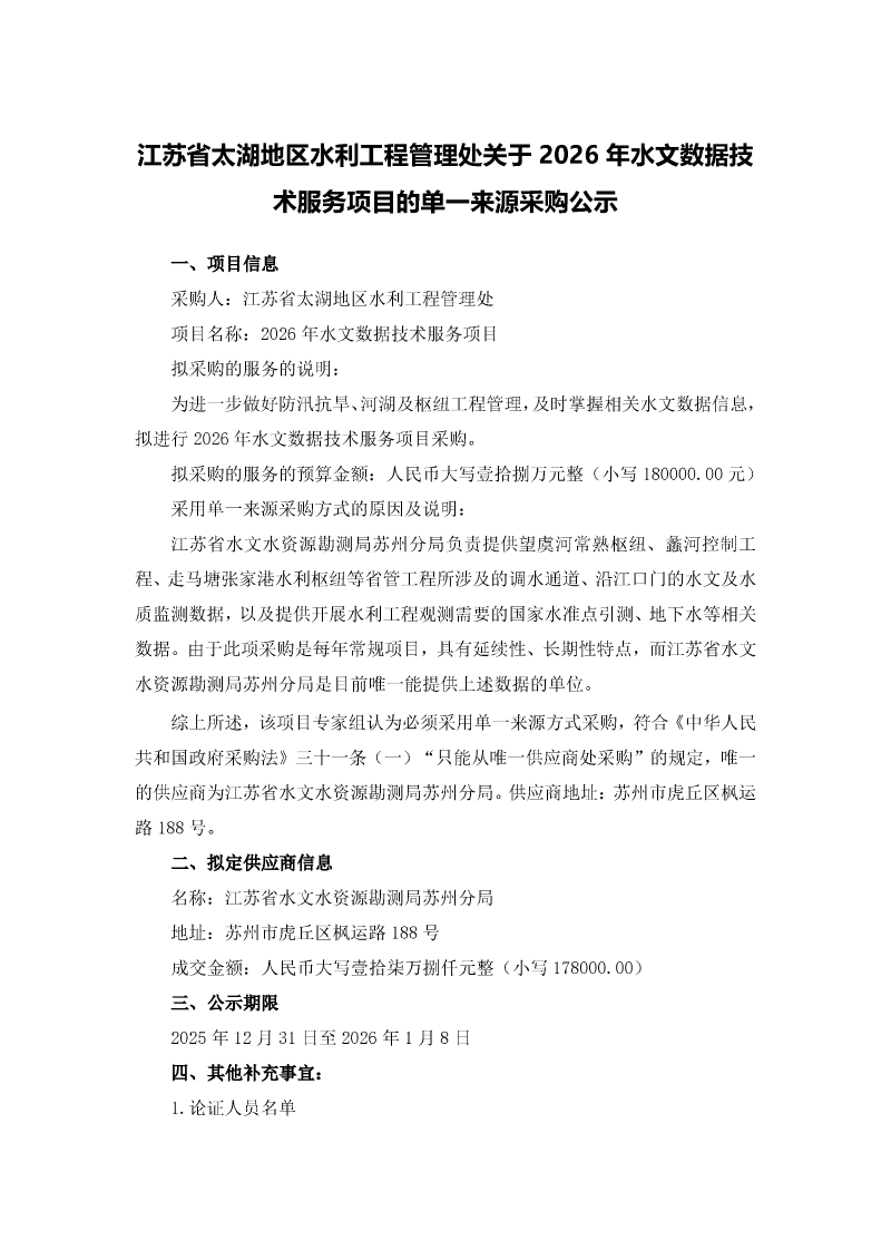 关于2026年水文数据技术服务项目的单一来源采购公示
