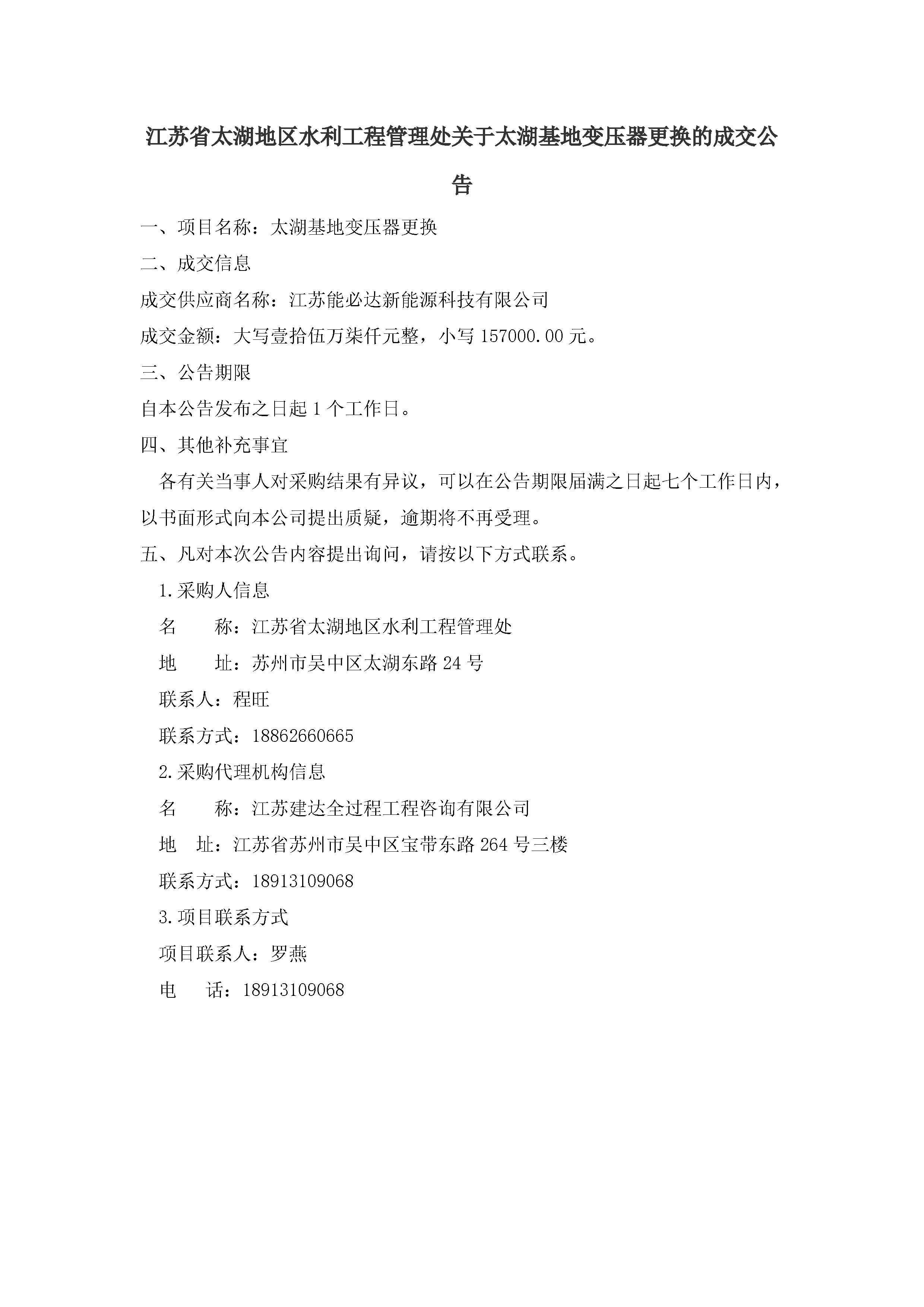 太湖基地变压器更换的成交公告
