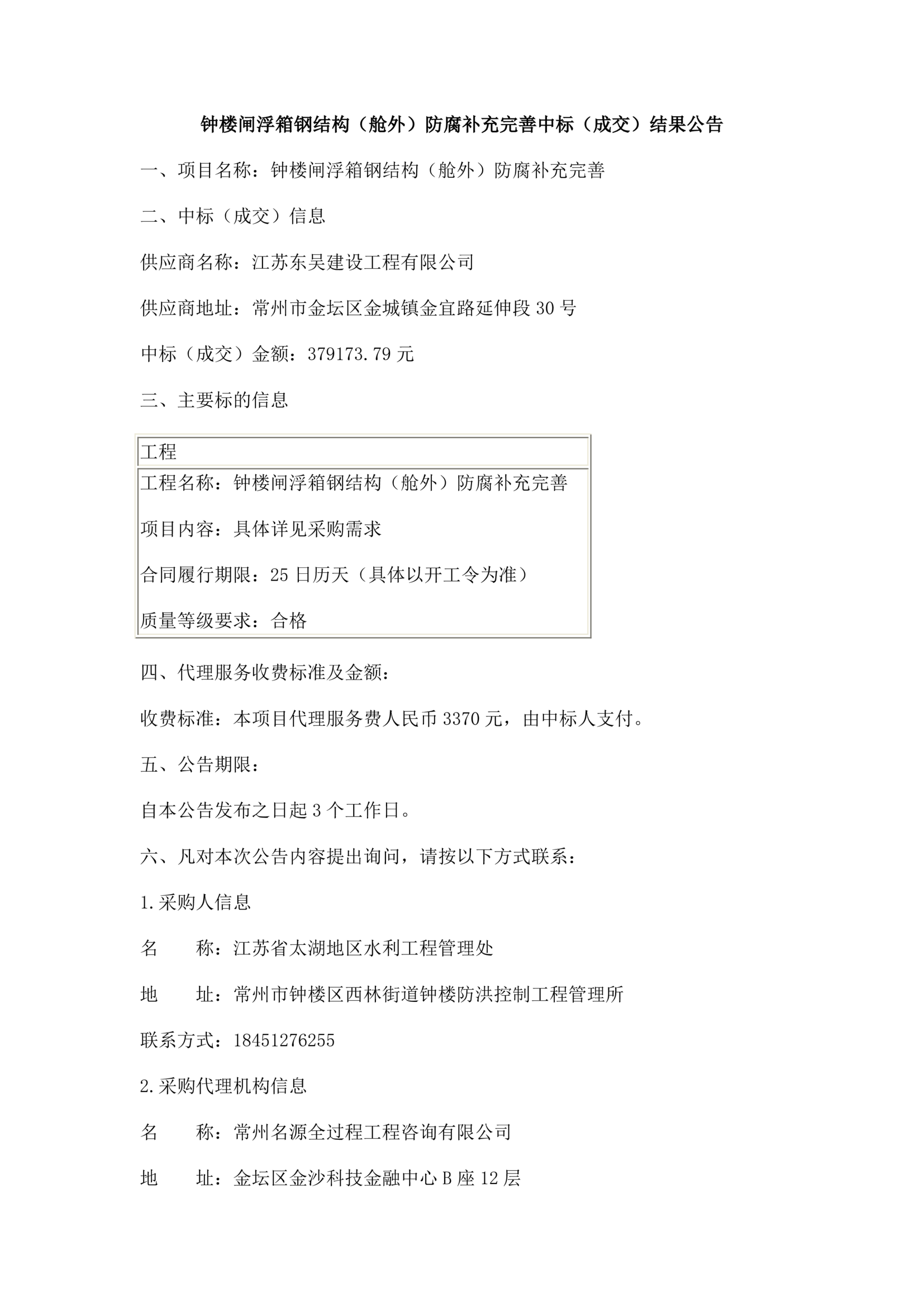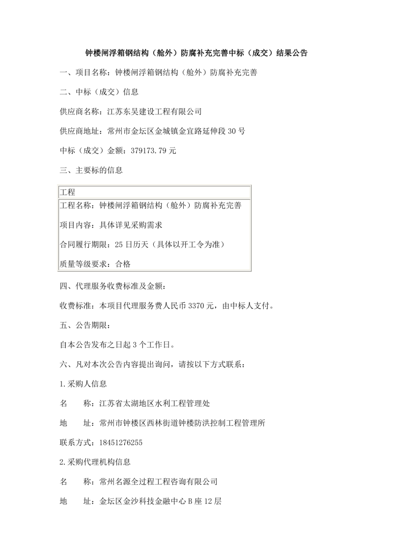 中标(成交)结果公告-钟楼闸浮箱钢结构(舱外)防腐补充完善