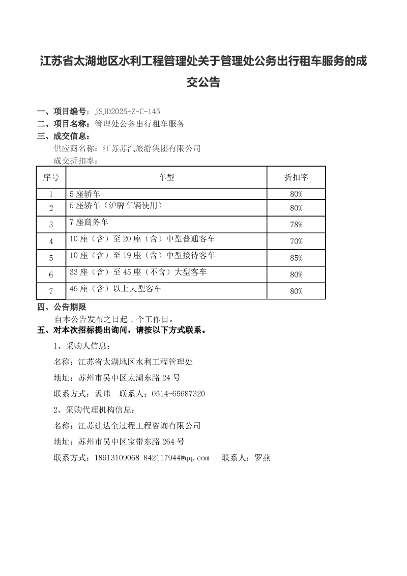 江苏省太湖地区水利工程管理处关于管理处公务出行租车服务的中标公告