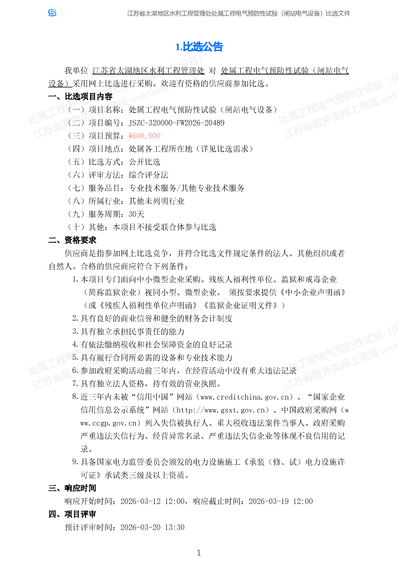 处属工程电气预防性试验(闸站电气设备)项目采购公告(二次)