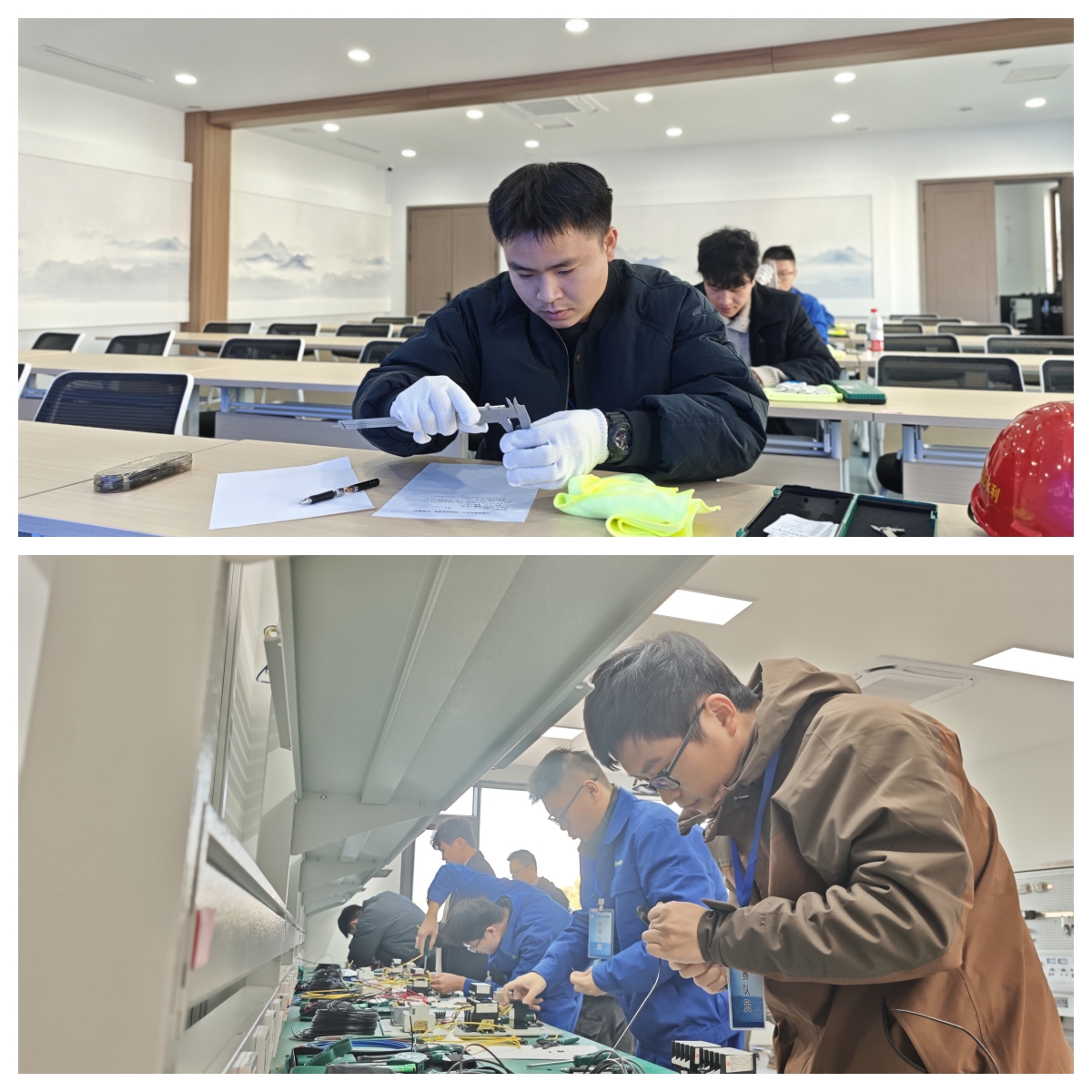 本次竞赛紧扣泵站水闸核心业务,贴合各工程实际运行需求,设置理论笔试与实操考核两大模块。其中,实操部分涵盖基础技能、水闸运行、泵站运行三大类别,包含电气接线、接地电阻测量、高压断路器检修等5个项目,全方位检验参赛选手的理论功底与实操能力,为技术骨干搭建了互学互鉴、展示风采的实战平台。理论考核环节率先开展,选手们奋笔疾书、沉着作答,现场秩序井然、氛围严肃。实操现场,选手们操作规范娴熟、动作精准利落,既展现了扎实的技能储备和优良的职业风貌,更赛出了锐意进取、争先创优的精神风采。