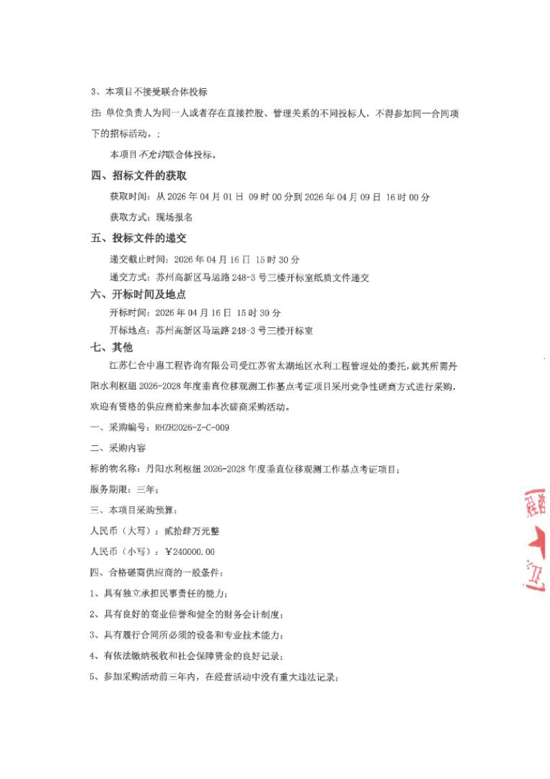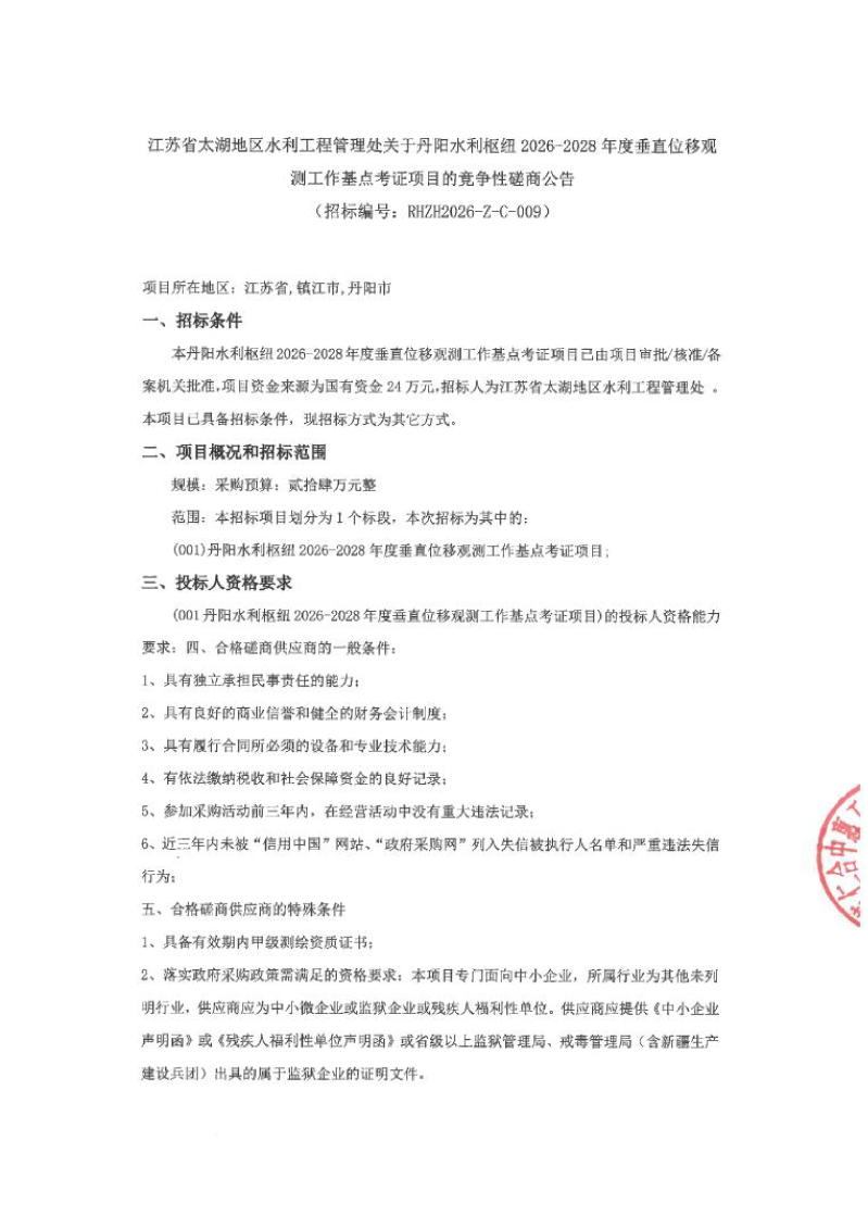 丹阳水利枢纽2026-2028年度垂直位移观测工作基点考证项目竞争性磋商公告