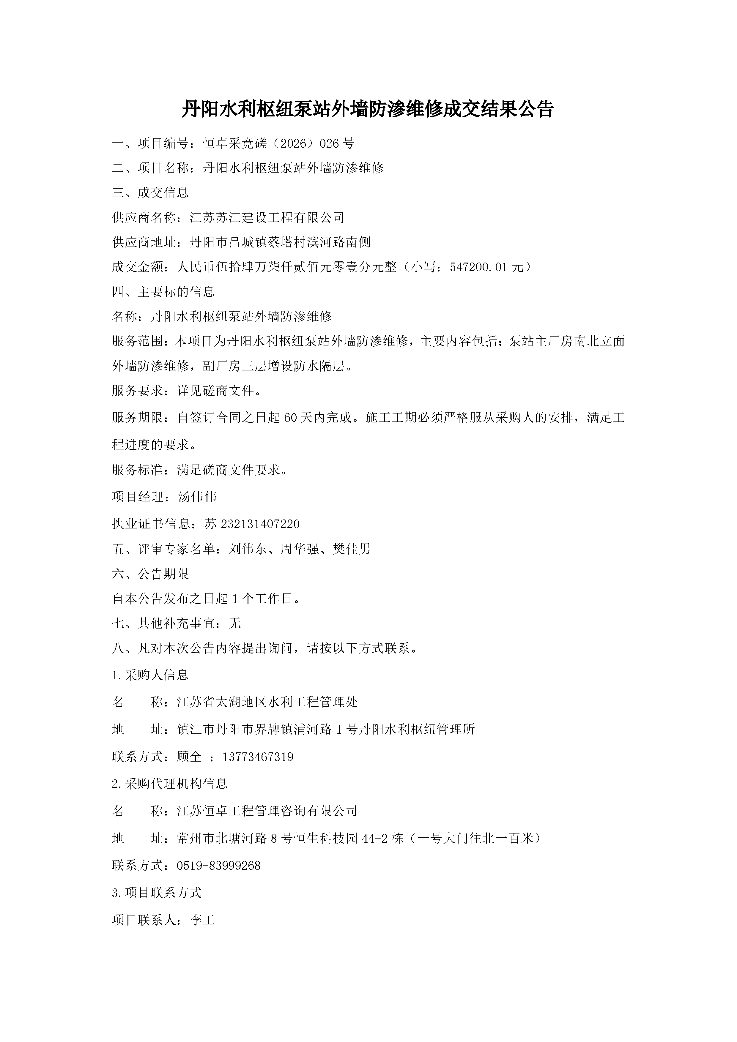 丹阳水利枢纽泵站外墙防渗维修项目中标公告