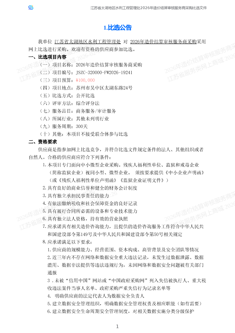 2026年造价结算审核服务商采购公告