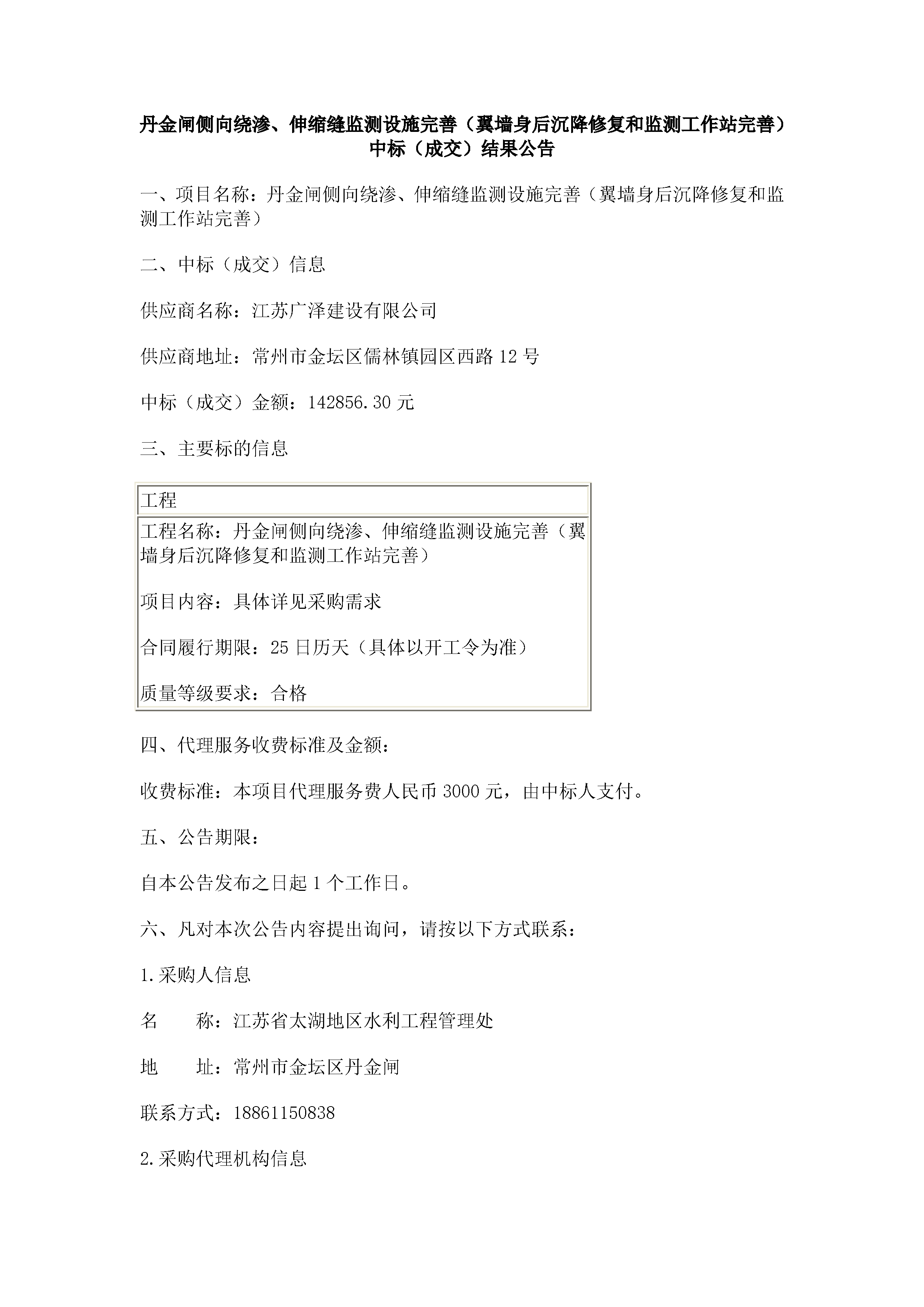 丹金闸侧向绕渗、伸缩缝监测设施完善(翼墙身后沉降修复和监测工作站完善)中标(成交)结果公告